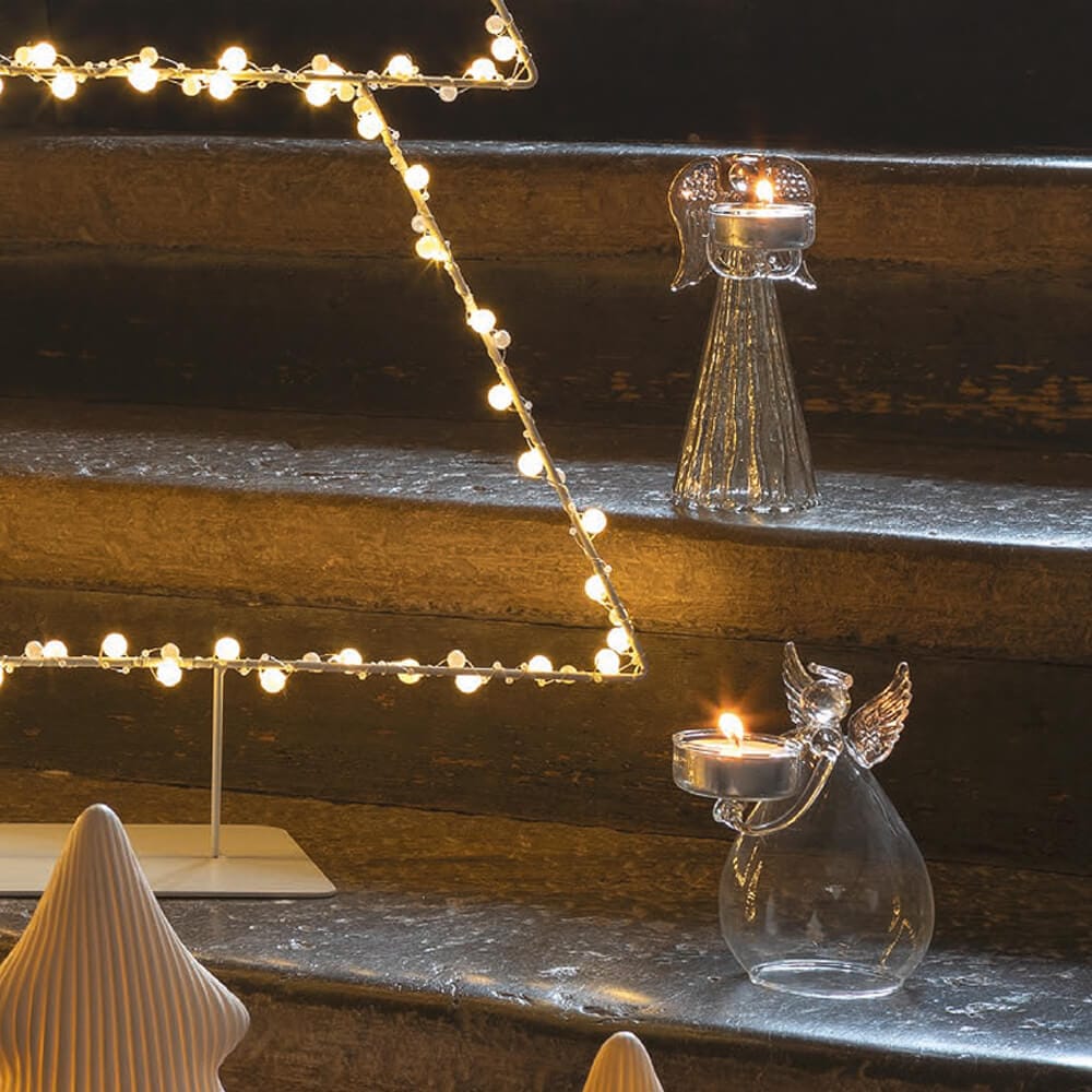 Este delicado portavelas de cristal con forma de ángel ilumina con suavidad cualquier espacio, creando un ambiente lleno de calma y belleza. Sus alas finamente detalladas y su diseño transparente reflejan la luz de la vela, aportando un brillo cálido y elegante.