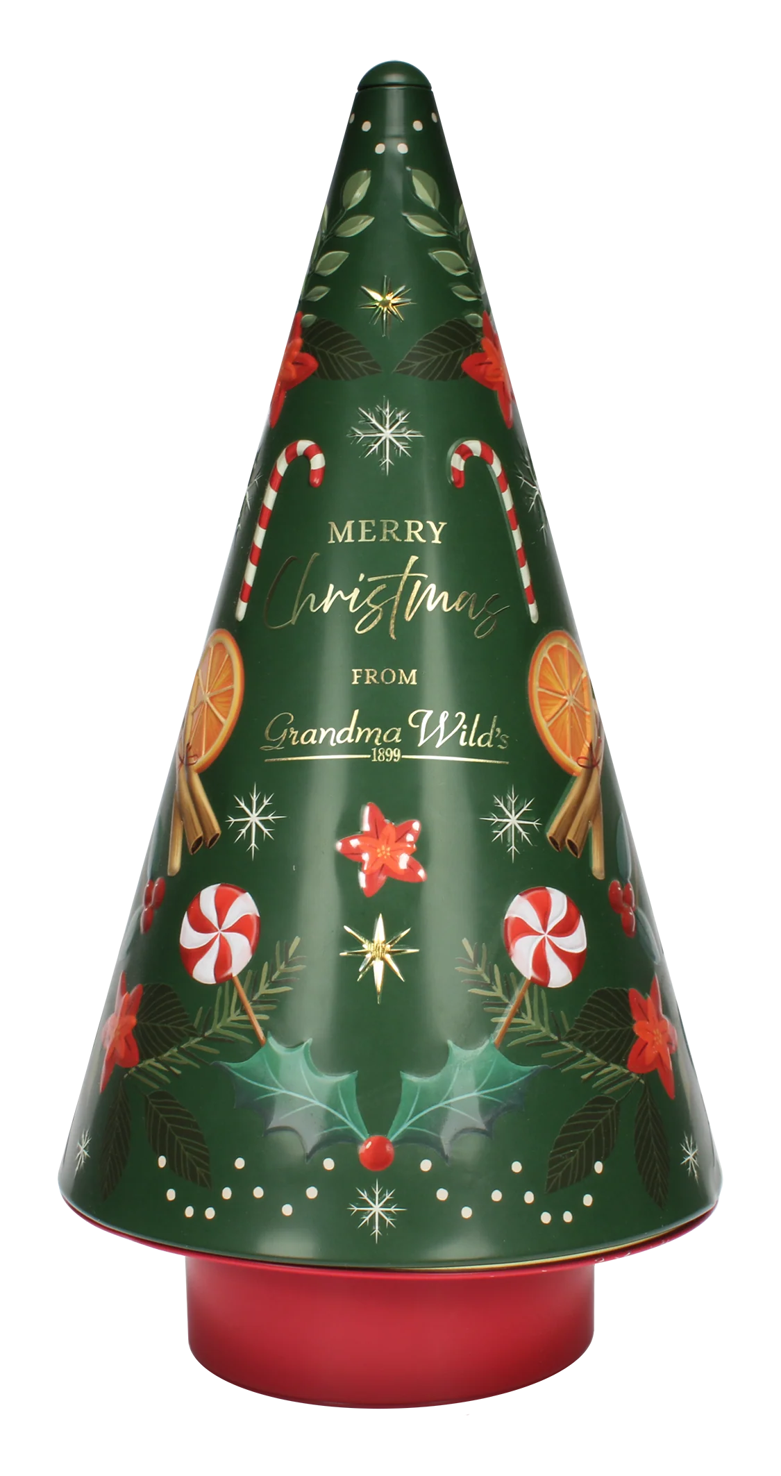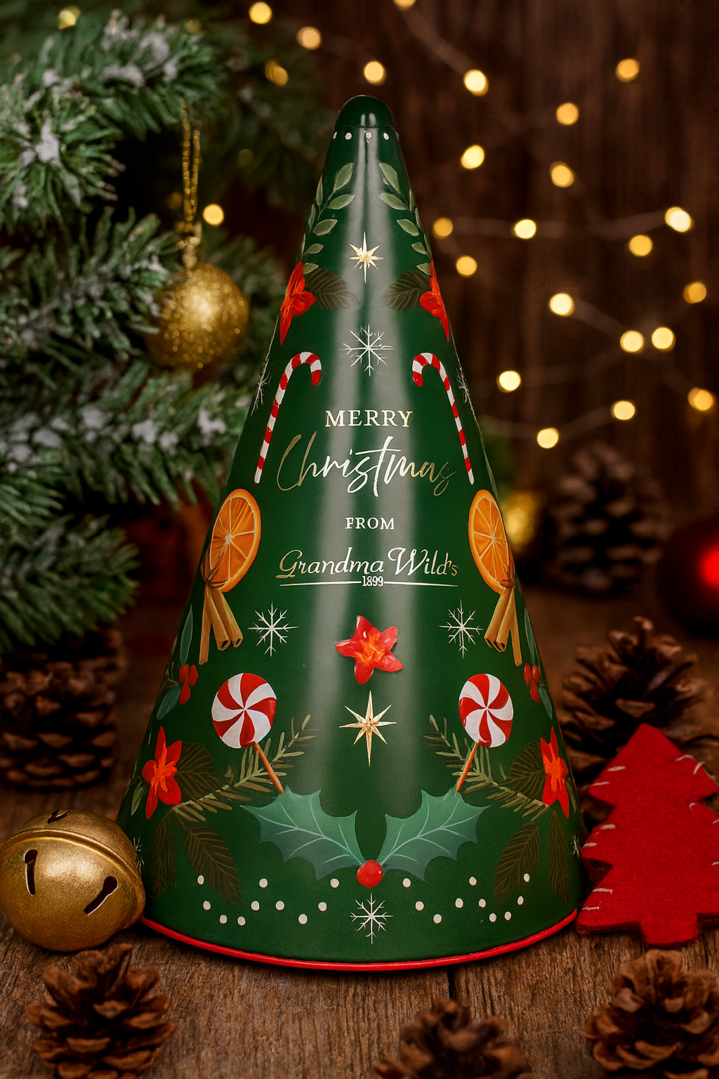 El árbol musical de “Grandma Wild’s” es mucho más que una lata decorativa: es una experiencia llena de encanto. Su diseño en relieve, inspirado en los clásicos bastones de caramelo, guarda en su interior crujientes galletas de jengibre horneadas con especias cálidas que llenarán tu hogar de aroma navideño.